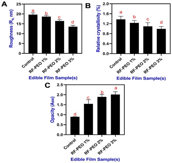 Roughness (A), relative crystallinity (B), and opacity (C) of edible films composed of RF-PEO at varying concentrations. The different letters of the alphabet shown on the bar diagram indicate significant differences.