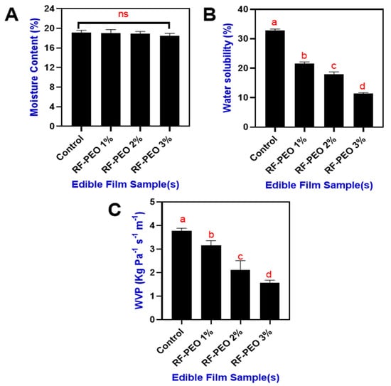 Moisture content (A), water solubility (B) and WVP (C) of edible films that made of RF-PEO at varying concentrations. The different letter of the alphabet shown on the bar diagram indicate significant differences and ns indicates non-significant differences.