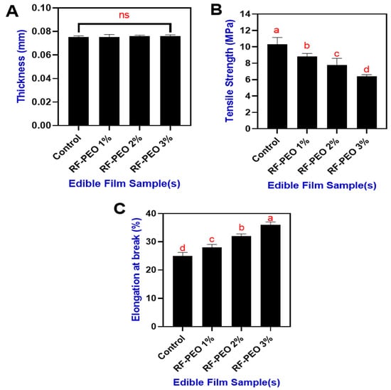 Thickness (A), tensile strength (B) and elongation at break (C) of edible films made of RF-PEO at varying concentrations. The different letters of the alphabet shown on the bar diagram indicate significant differences and ns indicates non-significant differences.