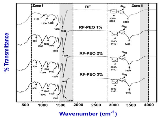 The FTIR spectra of an edible film made of RF and PEO at a specific concentration is presented in Figure 6. In general, the infrared spectroscopy of edible films involves analyzing the absorption of radiation and investigating the manner in which molecules and multi-atomic ions vibrate []. The peak pattern analysis revealed that there was a significant difference in peak patterns between the control film and the PEO-containing films. However, no significant differences in peak patterns were observed among the PEO-containing films regardless of the concentration used. Edible films made of starch and non-starch polysaccharides with glycerol as a plasticizer typically display FTIR spectra in the range of 558–2984 cm−1, regardless of whether they contain essential-oil-based active ingredients or not []. This is in accordance with the observation of present study. This study found major peaks in the FTIR spectra of the tested edible films in two regions: zone I, which ranged from 900 to 1600 cm−1, and zone II, which ranged from 2900 to 3400 cm−1. Specifically, the FTIR spectra of RF-PEO edible films exhibited characteristic peaks in zone I at specific wavenumbers: 900 cm−1 for C-F stretching, 1000–1200 cm−1 for C-O stretching, 1400 cm−1 for C-F stretching, 1500 cm−1 for N-O stretching, and 1600 cm−1 for C-C stretching. Conversely, the peaks at 900 and 1000 cm−1 were not spotted in the control films. Compared to zone II, the PEO-containing edible films exhibited more noticeable differences than the control samples in zone 1 based on the FTIR spectra peaks. However, the peaks observed in zone II were almost identical in all PEO samples; however, in the control films, the intensity of the peaks ranging between 3000 and 3200 cm−1 were slightly low. A decrease in the intensity indicates the lack of PEO in the control film and, consequently, weaker C-H stretching. The FTIR spectra peaks between 3300 and 3400 cm−1 represent the stretching vibration of OH and N-H in the samples, respectively. Peaks in this range indicate the stretching vibration of hydroxyl group (OH) and amino group (NH) symmetrical and asymmetrical CH bonds in the polymer structure. This is in accordance with the study of Sihombing et al. [], Asdagh et al. [], and Bahram et al. []. Furthermore, a reduction in the peak intensities of the hydroxyl group stretching (approximate peaks in the range of 3300–3400 cm−1) was noted in both control and RF-PEO edible films. In particular, low peak intensities were observed in the control film compared with the PEO-containing films. This observation suggests that the higher peak intensity in the PEO-containing films is an indication of the presence of crystalline and hydrophobic regions in the film, leading to a higher tensile strength. This is in accordance with the study of Sucheta et al. [] and Liang and wang [].