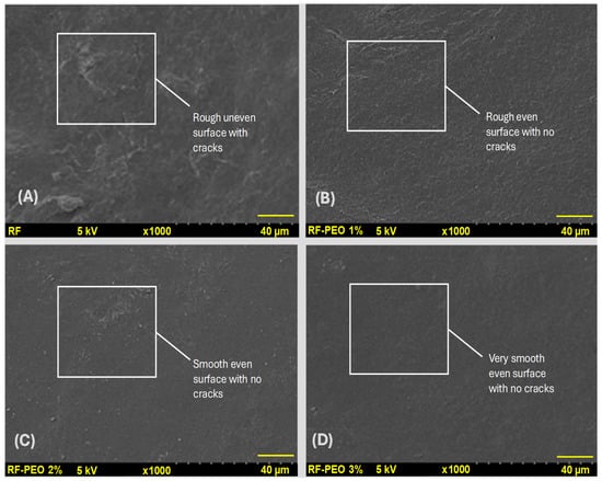 Figure 7 depicts the surface microstructure analysis of the edible film composed of RF with varying concentrations of PEO. The microstructural distribution of the edible film is a crucial factor that directly influences the film properties, including physical, optical, mechanical, and barrier properties [,,]. The present study found that microstructural observation indicated a significant improvement in the surface appearance of the RF film upon the addition of PEO compared with the control film. Furthermore, the concentration of PEO had a discernible effect on the film’s appearance, with a higher concentration resulting in a smoother and more cohesive surface, compared with lower PEO concentrations or the control. In contrast to the PEO-containing films, the control film that lacked EO exhibited a rough surface with numerous microcracks. Starch-based films tend to have naturally uneven and rough microstructural surfaces in the absence of optimized additives, which is consistent with the findings of Kang and Song [] and Acosta et al. []. The reason for the uneven surface structure of the edible film may be attributed to the migration of plasticizers to the film’s surface during the drying process, leading to the accumulation of excess plasticizers at the interface []. The reason for the smoother surface microstructure observed in the PEO films could be the result of the dispersal effect. This phenomenon occurs when the lipid droplets in the film emulsion create a continuous dispersion in the film’s polymer network, leading to a smoother surface []. Syafiq et al. [] found that the formation of cracks and uneven surfaces on the film could be attributed to the incomplete miscibility of starch in the film emulsion during processing, leading to increased surface coarseness.