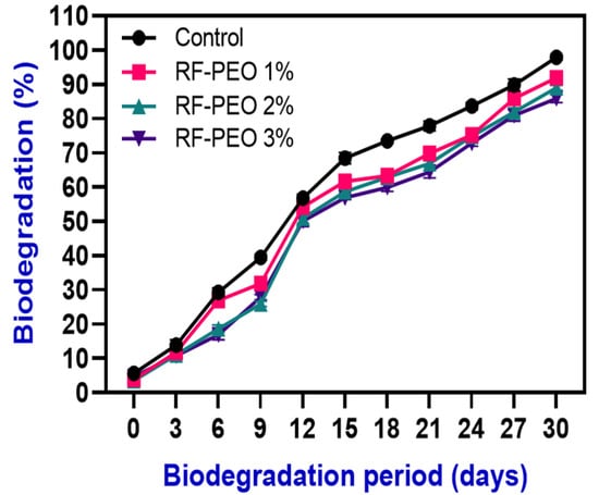 Biodegradability analysis assesses the ability of biodegradable films to break down when exposed to microorganisms in the soil, simulating degradation in a natural environment []. The degradation of RF films containing PEO was monitored for 30 days and the results are shown in Figure 8. Within 15 days, over 60% of the samples had degraded, and by 30 days all of the films had fully degraded. The films with lower concentrations of PEO exhibited faster degradation compared with those with higher concentrations. This may be because higher concentrations improved the stability and structural strength of the films and natural plant extracts, particularly essential oils, are known to have strong antimicrobial activity; this could negatively impact biodegradability by inhibiting microbial growth, which is a key factor in biodegradability. This finding is consistent with the study of Mir et al. []. Additionally, the hydrophilic nature of the RF film components promotes an increase in water activity, which encourages the growth of microorganisms. According to Dordevic et al. [], natural polysaccharides, a key ingredient in films, have a more significant role in biodegradation than other types of film-forming materials. Furthermore, the presence of natural fibers in RF that are prone to biodegradation may contribute to the degradation of the film; however, this process is dependent on the degradation of these fibers and the loss of interfacial resistance between the fibers and the polymer matrix.