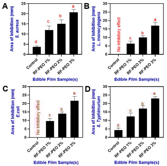 Antimicrobial activity of edible films composed of RF–PEO at varying concentrations against selected pathogens including (A) S. aureus, (B) L. monocytogens, (C) E. coli, and (D) S. typhi-murium.