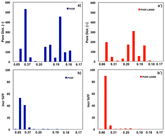 Pore size distribution and incremental filter flow (incr. %FF) estimated for pristine PVDF (a,a’) and engineered PVDF-LANM (b,b’) membranes.