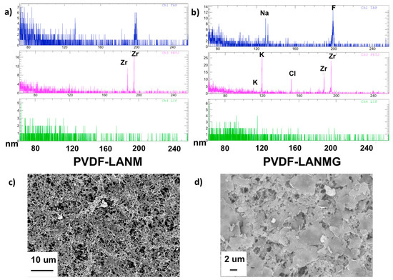 EDX spectra (a,b) and SEM images (c,d) collected on PNIPAM mixed hydrogels containing Zr-MOF (PVDFLANM) and Zr-MOF mixed with graphene (PVDF-LANMG).