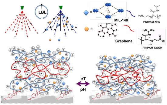 Representative sequential deposition of ionic PNIPAM hydrogels and Zr-MOF and graphene on a PVDF substrate via an LBL spray technique.