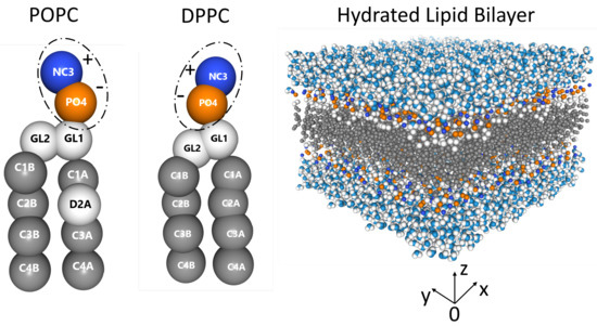 Zwitterionic lipid bilayers (see Figure 1) contain both positive (choline, blue) and negative (phosphate, orange) functional groups, resulting in a relatively high dipole moment at physiological pH [25,26,27,28]. Phospholipids such as 1-palmitoyl-2-oleoyl-sn-glycero-3-phosphocholine (POPC, 16:0/18:1 PC) and 1,2-dipalmitoyl-sn-glycero-3-phosphocholine (DPPC, 16:0/16:0 PC) spontaneously self assemble into bilayers in the presence of water (Figure 1), with their hydrophobic acyl tails forming the bilayer’s hydrophobic core, while their headgroups interact with the aqueous phase [29]. Both lipids occur naturally, and are involved in different cellular processes on length scales ranging from the nanometer to the micrometer [30,31,32,33,34].