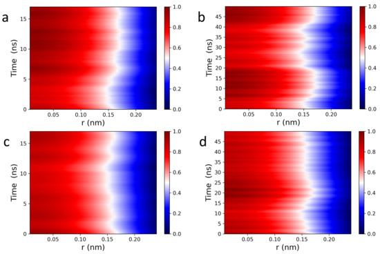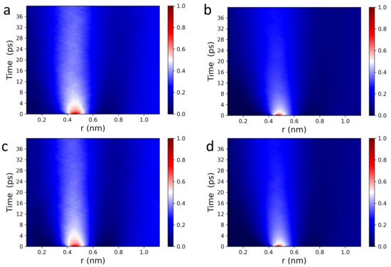 The Van Hove function captures spatiotemporal correlations in the form of particle density fluctuations and as such, can be used to directly access density fluctuations measured via inelastic neutron scattering (INS) [51]. Figure 2 displays 2D and 3D Van Hove correlation functions (see Equations (1) and (2)) of POPC (a,b), and DPPC (c,d) headgroup dipoles, whose ultrafast dynamic behavior is consistent with what has been previously observed in fluids by IXS [46,47,48,49] and INS [51]. For both POPC and DPPC bilayers, headgroup dipoles have sharp intensity peaks located at ∼0.45 nm, consistent with nearest neighbor chain-chain distances observed in PC bilayers (∼0.4 nm). The red sharp peaks (in the normalized intensity scale bars located to the right of Figure 2) indicate that the PC headgroups experience rattling or “cage-like” dynamics in the first 2–4 ps, followed by a long lasting relaxation process, i.e., the intensity drops down from “red” to “white”. Interestingly, correlation functions are more informative than (see Figure 2), i.e, Figure a,c vs. Figure b,d. Specifically, the “caging phase” of the collective dynamics associated with the headgroup dipoles undergoes a clear transition (white arcs around the red peaks), and the traces of the relaxation phase are more detailed and last significantly longer. As such, it is physically justified to independently analyze the behavior of the correlation function of the POPC and DPPC headgroup dipoles, both laterally and along the z-axis.