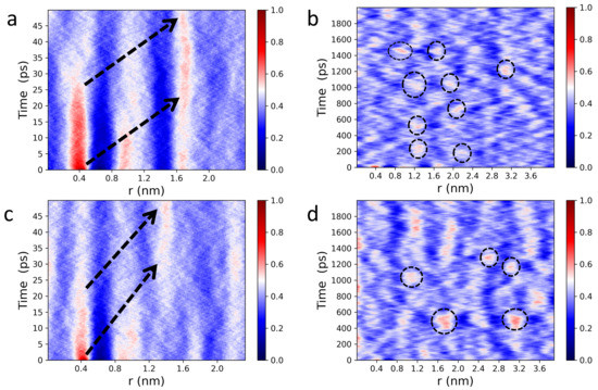 Lateral, spatiotemporal pair correlations for POPC (a,b) and DPPC (c,d) headgroup dipoles calculated from Equation (1). Wide, red line intensity peaks (a,c) indicate strongly correlated “cage-like” dynamics, followed by smooth relaxation processes (nearly straight white traces) along the first, second, and third coordination shells. Black arrows indicate the propagation of membrane lateral stress, in real space and time, migrating through the different coordination shells. An extended spatiotemporal picture of collective headgroup dipole motions (b,d). The circled intensity peaks highlight areas of localized mechanical stress within otherwise relaxed neighborhoods in space and time. “Wiggling” low intensity areas (dark blue regions) feature the co-existence of different collective vibrational patterns at the water-bilayer interface.