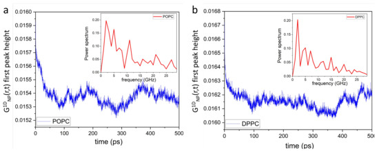 Figure 6 shows the time evolution of the first peak height of POPC (a) and DPPC (b) lipid headgroup dipoles. The insets to the figure generated using Fourier transforms, show the power spectra of the POPC and DPPC headgroup dipoles ranging between ∼0.05 GHz and ∼0.5 GHz. Such continuous collective movements of lipids in a bilayer are known as membrane surface undulations and play important roles in different biological processes [61,62,63].