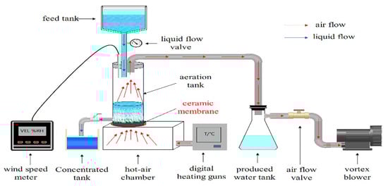 The process of evaporation using a ceramic aeration membrane is shown in Figure 1. Red arrows indicate the airflow direction. Negative air pressure was provided by the suction of the vortex blower (YASHIBA HG-90B, 120 W, Ningbo, Zhejiang, China). The simulated industrial waste heat was supplied by a hot-air chamber (DELI DL391160, 1600 W, Shanghai, China). The flow rate was controlled by an airflow valve connected to the vortex blower and then monitored by a wind speed meter (SMART SENSOR AR866A, Shenzhen, Guangdong, China). Blue arrows indicate the liquid flow direction. The feed solution was water or sodium chloride solution (3 wt%). The liquid in the aeration tank was supplied from the feed tank, and the flow rate was controlled by a liquid flow valve. The remaining liquid was discharged to the concentrated tank through the lower outlet after the solution in the aeration tank had evaporated to a saturated concentration (25 wt%). The water vapor generated in the aeration tank is condensed in the produced water tank.