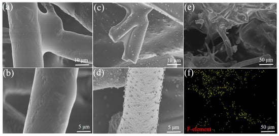 SEM and EDS images of ceramic membrane: (a,b) SEM of unmodified ceramic membrane; (c,d) SEM of PDMS-ceramic membrane; (e) SEM of PTFE-ceramic membrane; and (f) EDS mapping of PTFE-ceramic membrane.