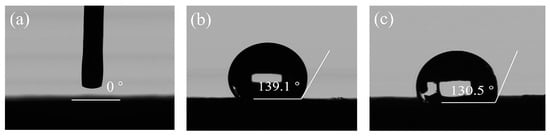 Water contact angle of ceramic membranes: (a) unmodified ceramic membrane; (b) PDMS-ceramic membrane; and (c) PTFE-ceramic membrane.