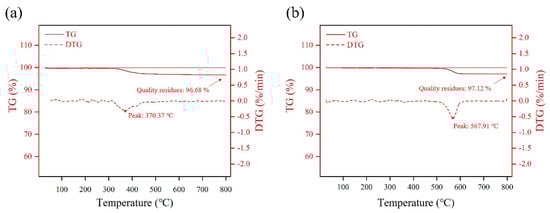 DTG and TG curves of ceramic aeration membranes: (a) PDMS-ceramic membrane and (b) PTFE-ceramic membrane.