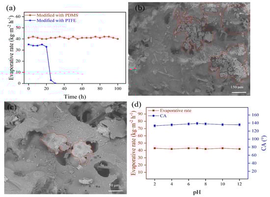 The evaporative rate using PDMS-ceramic aeration membrane reaches 43 kg m−2 h−1 and remains stable during the continuous operation of 100 h (Figure 5a). The membrane surface is continuously purged during aeration, enhancing the ability to avoid membrane contamination. However, the evaporative rate using a PTFE-ceramic aeration membrane shows a rapid decrease after 20 h. The surface morphology of the failed PTFE-ceramic aeration membrane is observed by SEM (Figure 5b,c). It can be seen that the crystalline grains appear on the surface, and part of the pores is blocked by these crystalline grains (Figure 5c), which causes a rapid decrease in the evaporative rate. The water contact angle on the failed PTFE-ceramic aeration membrane is measured again and decreases to 0°, implying that the PTFE modifier peels off from the membrane due to the non-stick characteristics of PTFE [24,25]. The binding between PTFE and the ceramic membrane is not strong, and the PTFE modifier is easy to peel off, which leads to the failure of the PTFE-ceramic aeration membrane. The failed PTFE-ceramic aeration membrane is wetted by sodium chloride solution during aeration, and sodium chloride crystallizes in the membrane pores, causing membrane fouling. Thus, the PDMS-ceramic aeration membrane is used in the subsequent tests.