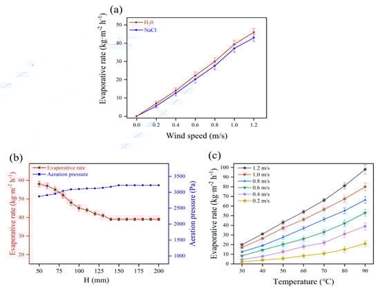 In this work, many micron-sized bubbles are produced to improve the evaporation area. The air volume passed through the same membrane area directly affects the number of bubbles. The larger the air volume is, the more the number of bubbles is. The air volume that passes through the unit membrane area in a given time is determined by wind speed. The influence of wind speed on the evaporative rate at an air temperature of 50 °C and a liquid column height of 50 mm is shown in Figure 6a. More bubbles are produced as wind speed increases and the evaporation area is significantly enlarged. The upper limit of wind speed in this study is 1.2 m/s because the gas–liquid contact time will be reduced significantly if the wind speed is too high.