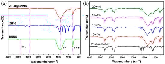 FTIR spectrum of (a) ZIF-8, BNNS, and ZIF-8@BNNS and (b) Pristine Pebax and ZIF-8@BNNS/Pebax MMMs with different loadings.