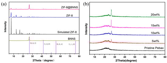 XRD patterns of (a) ZIF-8, BNNS, and ZIF-8@BNNS and (b) Pristine Pebax and MMMs with different loadings.