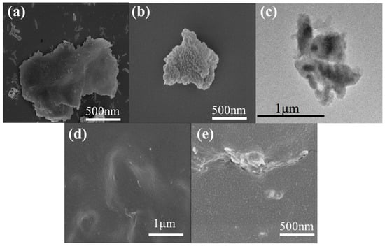 SEM and TEM pictures of (a) BNNS, (b,c) ZIF-8@BNNS composite materials, and (d,e) the surface and cross-section of the ZIF-8@BNNS/Pebax MMM loaded with 20 wt.%.