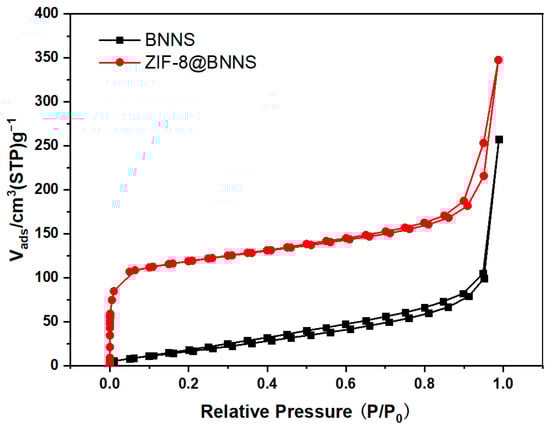 The BET surface area, BJH pore volume, and average pore size of the BNNS and ZIF-8@BNNS composite material were measured using N2 adsorption isotherms. As shown in Figure 5 and Table 2, both samples exhibited type IV adsorption isotherms with characteristic hysteresis loops, indicating the presence of numerous mesoporous structures. The in-situ growth of ZIF-8 on the BNNS surface increased the number of pores, resulting in a significantly higher BET surface area of 448.36 m2 g−1 compared to the value of 76.35 m2 g−1 for BNNS alone. This enhancement can be attributed to the porous channels provided by the ZIF-8 layer, which facilitates the transportation of gas molecules through the porous layer. The average pore size of ZIF-8-BNNS creates small pores and reduces the average pore size. These results demonstrate the potential of ZIF-8@BNNS composite materials as highly efficient adsorbents and catalysts for various applications.
