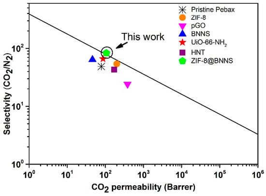 To investigate the effect of the ZIF-8@BNNS filler content on the permeability of MMMs, pure gas permeation tests were conducted on the MMMs with N2 and CO2 at 3 bar and room temperature (25 °C). The gas permeability and selectivity of the MMMs with different filler contents, ranging from 0 to 20 wt.%, were measured, as shown in Figure 6a. Each membrane was tested three times, and the average values calculated. The results indicated that the CO2 permeability gradually increased with increased filler loading, resulting in an increment of 130% compared to pristine Pebax when the ZIF-8@BNNS loading was 20 wt.%. With a 20% filler loading, the ZIF-8@BNNS/Pebax MMM exhibited an increase in permeability from 80.97 to 106.5 Barrers due to ZIF-8′s high porosity and flexible framework, which improved CO2 diffusion. Moreover, the N2 permeability slightly decreased from 1.67 to 1.28 Barrers. This phenomenon can be attributed to the microstructure of ZIF-8@BNNS. The large ZIF-8 cavity provides high gas diffusivity and introduces a larger free volume, which accelerates the diffusion of CO2. Further, BNNS acted as a barrier to block gas molecules in the membranes, leading to a decrease in N2 permeability. Furthermore, the ZIF-8@BNNS/Pebax MMM demonstrated higher CO2/N2 selectivity compared to the pristine membrane due to the ZIF-8 layer constructing a continuous pathway for CO2 transmission. Consequently, the significant increase in CO2 permeability resulted in a better separation performance than the pristine membrane.