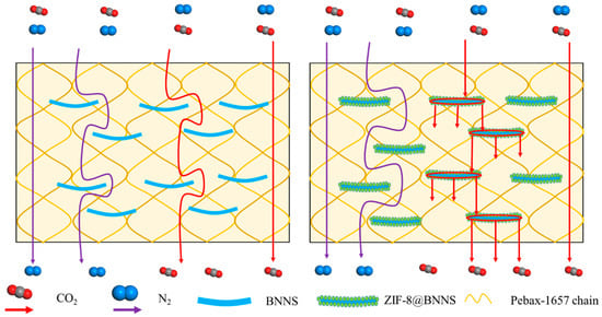 Two-dimensional (2D) nanomaterials, due to their high aspect ratio and high specific surface area, which provide a more tortuous pathway for larger gas molecules, are frequently used in membrane separation. However, in mixed-matrix membranes (MMMs), the high aspect ratio and high specific surface area of 2D fillers can increase transport resistance, thereby reducing the permeability of gas molecules. In this work, we combine boron nitride nanosheets (BNNS) with ZIF-8 nanoparticles to develop a novel material, ZIF-8@BNNS, to improve both CO2 permeability and CO2/N2 selectivity. Growth of ZIF-8 nanoparticles on the BNNS surface is achieved using an in-situ growth method where the amino groups of BNNS are complexed with Zn2+, creating gas transmission pathways that accelerate CO2 transmission. The 2D-BNNS material acts as a barrier in MMMs to improve CO2/N2 selectivity. The MMMs with a 20 wt.% ZIF-8@BNNS loading achieved a CO2 permeability of 106.5 Barrer and CO2/N2 selectivity of 83.2, surpassing the Robeson upper bound (2008) and demonstrating that MOF layers can efficiently reduce mass transfer resistance and enhance gas separation performance.