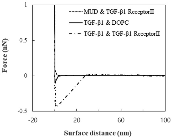 Little substantial attraction was observed between TGF-β1 receptor Ⅱ and the MUDs, and this observation showed that the MUDs made a great background for measuring the TGF-β1-specific interaction. In contrast to the attraction between TGF-β1 receptor Ⅱ and the MUDs, the attraction between the DOPC layer and the TGF-β1 immobilized on the tip was 0.06 to 0.1 nN. The attraction between TGF-β1 and TGF-β1 receptor Ⅱ was clearly distinguished: 0.4 to 0.5 nN. These attractions are shown in the plot of the force versus the surface distance (Figure 1). Not only the magnitude of the attraction but also the snap-off was significantly different. Therefore, the attraction of the DOPC layer seemed to be non-specific membrane-adhesion force, while the attraction of TGF-β1 receptor Ⅱ did seem to be specific.