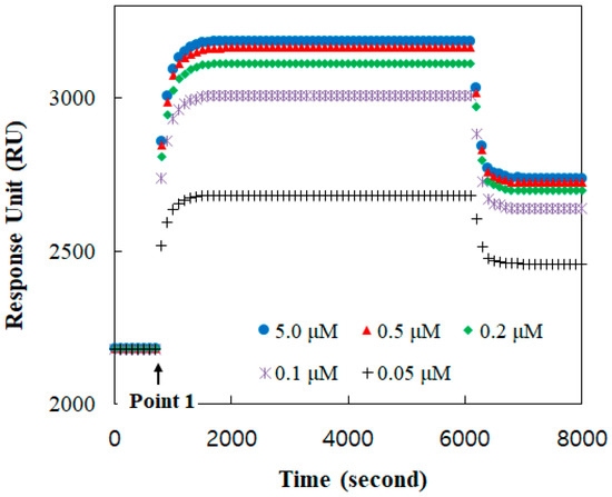 The binding formation between TGF-β1 and its receptor was monitored with respect to time using the SPR response, as shown in Figure 2. A baseline, before point 1, was established at the receptor reconstituted under the buffer solution. At point 1, the TGF-β1 solution was injected. The amount of the bound TGF-β1 was increased with its concentration. The TGF-β1 receptors were mostly occupied at a solution of more than 0.5 μM TGF-β1. Therefore, the response at 2 μM was clearly presumed to be for all receptors.