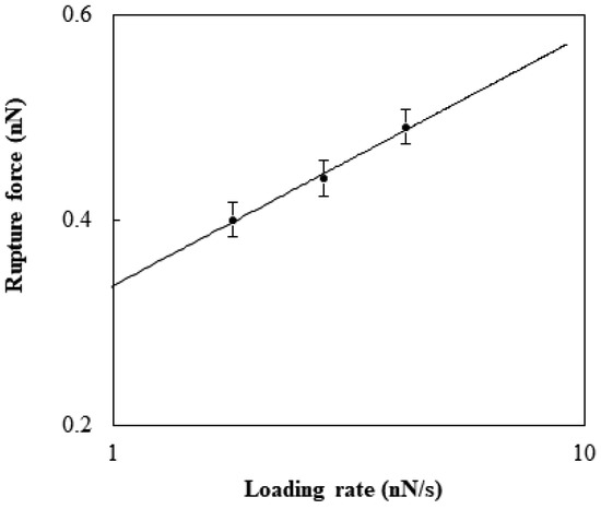The rupture was affected by the loading rate. As the rates, 1.8, 2.8, and 4.2 nN/s were selected and estimated by multiplying the retraction rate by the cantilever spring constant. The force to generate the rupture at a given loading rate was considered with the theoretical model developed by Kramer [22]. The rupture force, F (N), has the following relation with the loading rate, r (N/s):
