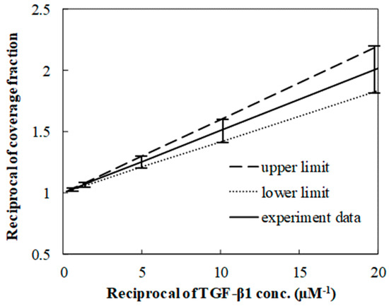 Langmuir isotherms were used to estimate the equilibrium constant of the TGF-β1 SPR binding to its receptor, which was from fitting the fraction with respect to the TGF-β1 concentration. Since the linear fit was essential to estimate the constant, the fraction and the concentration became the reciprocal form (Figure 4 on the next page). The constant was in the range of 1 × 107 to 3 × 107 M−1, which was close to the value of around 107 M−1 which was found in the results of the previous research [25,26]. Both lower and upper limits were extracted from the extreme values of the ranges where the data were distributed.