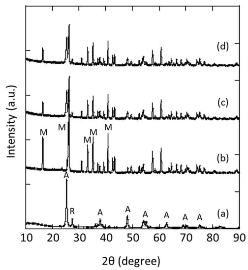 - Arroyo, R.; Cordoba, G.; Padilla, J.; Lara, V. Influence of manganese ions on the anatase–rutile phase transition of TiO2 prepared by the sol–gel process. Mater. Lett. 2002, 54, 397–402. [Google Scholar] [CrossRef]