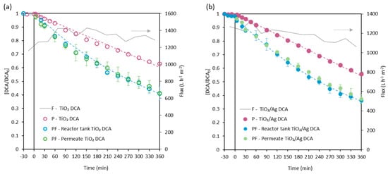 Comparison of DCA degradation in photocatalytic submerged membranes (P: photocatalytic experiments) and coupled photocatalysis and flow-through permeation experiments (PF: photocatalytic and flow-through). Total flux, in grey lines, of flow-through permeation experiments at a transmembrane pressure of 1 bar. (a) TiO2 membrane and (b) TiO2/Ag membrane.