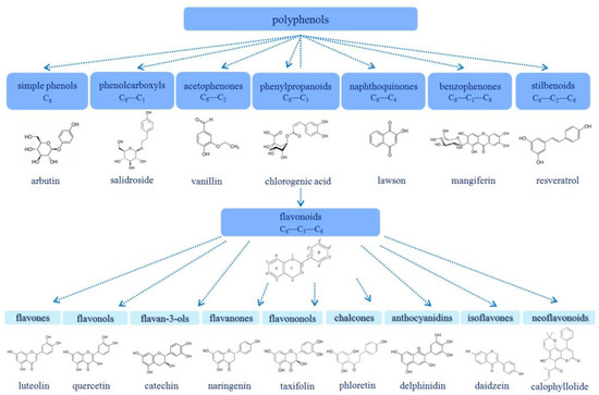Phenolic compounds are aromatic molecules containing one or more hydroxyl group in the benzene rings [1]. Substances with one or more than two hydroxyl groups are called phenols and polyphenols, respectively. Preclinical and clinical studies support the protective action of polyphenols in cardiovascular diseases [2], neurodegenerative diseases [3], and cancer [4] due to high anti-oxidant activity, which is related to the number of OH groups. Phenolic compounds are mainly represented in plants by flavonoids, lignans (polymer phenolic compounds), and tannins, and are accumulated in flower petals, fruits, roots (licorice), shoots (motherwort), etc. About 8000 plant phenolic compounds are known to date, and their number is growing every day. The classification of phenolic compounds occurs depending on the number of aromatic rings and the number of carbon atoms attached to the ring. Figure 1 demonstrates the classification of plant polyphenols with typical chemical structures in each class: simple phenols, without extra carbon atoms; phenolcarboxyls, containing one additional carbon atom; acetophenones, containing two additional carbon atoms; phenylpropanoids, containing three additional carbon atoms; naphthoquinones, containing four additional carbon atoms; benzophenones, containing two aromatic rings linked by a bridge of one carbon atom; stilbenoids, containing two aromatic rings linked by two carbon atoms; and flavonoids, containing three aromatic rings linked by three carbon atoms.