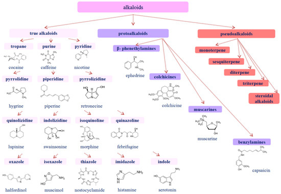 Alkaloids are heterocyclic compounds containing one or more nitrogen atoms and are characterized by significant structural diversity. They are usually divided into several main groups [57]. As a rule, alkaloids are found in plants in the form of salts of malic, tartaric, citric, and other acids. They are divided into true alkaloids; protoalkaloids, which have nitrogen in the side chain; and pseudoalkaloids, which are synthesized through transamination [58] (Figure 2). Figure 2 demonstrates the typical chemical structures of alkaloids belonging to different chemical groups. Vasodilators, anti-hypertensive and anti-arrhythmic compounds, anesthetics, and analgesics have been found among plant alkaloids [59,60]. Alkaloids also demonstrate anti-proliferative, anti-bacterial, and anti-oxidant properties [61]. The therapeutic potential of alkaloids determines their wide industrial application. The immunomodulatory properties of plant alkaloids are also actively discussed [62]. Information on the pharmacological action of some representatives of alkaloids is presented below.