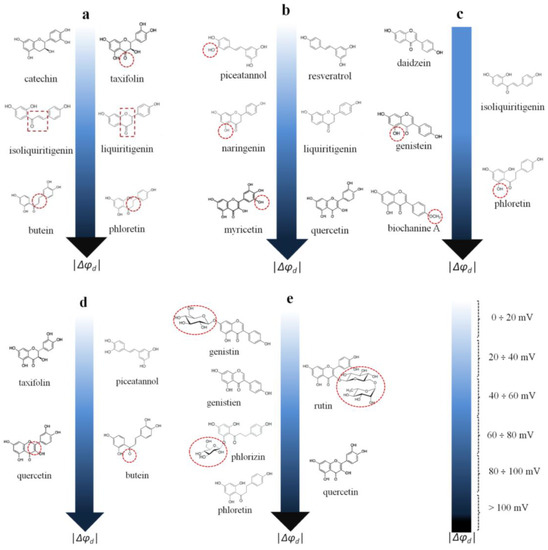 Figure 5. The relationships between the structure of polyphenols and their dipole-modifying ability. (a) The independence of dipole-modifying effect of polyphenols on the presence of the carbonyl group, heterocycle and double bond in the fragment linking the phenolic rings of molecules (from top to bottom); (b) The independence of dipole-modifying effect on inclusion of an additional OH group in the molecules of flavanones, flavonols, and stilbenoids (from top to bottom); (c) The dependence of dipole-modifying ability of isoflavones (left side) and chalcones/dihydrochalcones (right side) on the inclusion of additional OH- and methyl groups; (d) The dependence of dipole-modifying ability of flavonoid on the presence of the double bond in the heterocycle (left side) and the oxidation and length of the fragment linking the phenolic rings (right side); (e) The dependence of dipole-modifying ability of flavonoids on the glycosylation of isoflavones/dihydrochalcones (left side) and flavonols (right side). - (3)