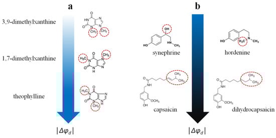 Figure 6. The relationships between the structure of alkaloids and their dipole-modifying ability. (a) The dependence of dipole-modifying ability of xanthines on the localization of the methyl groups; (b) The independence of dipole-modifying effect of protoalkaloids on the presence of OH-group and the double bond in the side chain of phenylethylamines and benzylamines respectively (from top to bottom). The color intensity designation is shown in the caption of Figure 5. - (2)