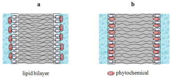 Two different ways of modulating dipole potential with various phytochemicals: (a) change in the membrane hydration and (b) intercalation of a compound’s own dipoles into the membrane along with disordering of membrane lipids. The grey color indicates the hydrocarbon core of the lipid bilayer; the blue color indicates the membrane bathing solution.