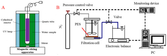 Figure 1. Schematic diagrams of UV radiation reactor (A) and UF membrane filtration experimental setup (B).