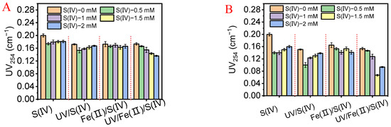 Figure 2. UV254 of the UF permeates with various pretreatments and different S(IV) concentrations for treating (A) EOM solution and (B) ALW.