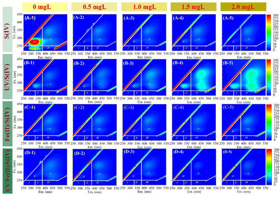 Figure 3. EEM of the permeate of UF treating EOM solution with different pretreatments and S(IV) dosages. (A-1A-5) S(IV), (B-1B-5) UV/S(IV), (C-1C-5) Fe(II)/S(IV), and (D-1D-5) UV/Fe(II)/S(IV) pretreatment systems with S(IV) dosage at 0, 0.5, 1.0, 1.5, and 2.0 mg/L, respectively. UV irradiation time was 20 min, and Fe(II) dosage was 0.04 mM.