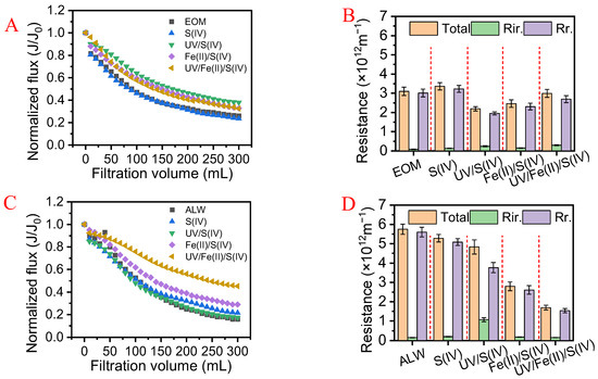 Figure 5 shows the membrane flux and fouling resistance in the UF tests with different pretreatments for treating EOM and ALW. As illustrated in Figure 5A, in the UF of the EOM, a rapid drop in membrane flux was observed and the final normalized flux decreased to 0.26. Stand-alone S(IV) pretreatment did not alter the flux decline. In comparison, other pretreatments alleviated the flux decline to some extent. Particularly, UV/S(IV), Fe(II)/S(IV), and UV/Fe(II)/S(IV) systems corresponded to final normalized fluxes of 0.38, 0.33, and 0.32, respectively. The UV-activated S(IV) showed the best fouling control performance, which was consistent with previous studies [21,27]. However, the extra organic matter may access the effluent of UV/S(IV)—UF, as evidenced by the results of EEM (Figure 3(B-1–B-5)).