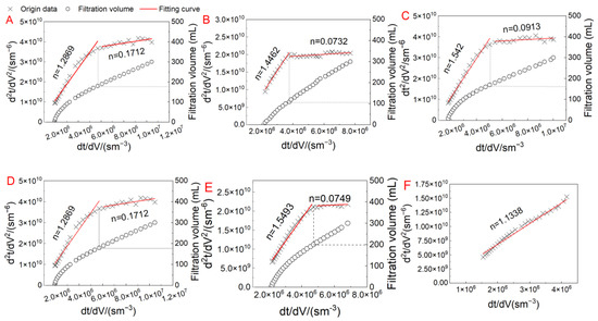 The membrane fouling mechanism was analyzed by fitting the flux data to the classic Hermia model. The dt/dV and d2t/dV2 relationship curves of the UV/Fe(II)/S(IV) system during the filtration of EOM and ALW at different S(IV) dosages are presented in Figure 6. The n-values fitted to the data were bipartite in distribution when the S(IV) dosage did not exceed 1.5 mg/L, indicating the coexistence of multiple mechanisms in the EOM filtration with UV/Fe(II)/S(IV) pretreatment. In Figure 6A–E, the n-values fluctuated between 1.2 and 1.6 in the first stage, suggesting that the standard pore blocking played a significant role. The small organic molecules in EOM could enter the membrane pores at the early stage, resulting in a rapid flux decline. The successive pore blocking and cake filtration were typical membrane fouling mechanisms presented in the filtration of NOM and an algal organic matter [44,45]. At the beginning of filtration, biopolymers could access the open membrane pores rapidly, leading to pore blocking, and then the organic matter gradually accumulated and formed a cake/gel layer on the membrane surface [46]. It could be found that with the increase of S(IV) dosage, the appearance of cake filtration was gradually postponed, and it disappeared (with standard pore blocking dominating the whole UF) when S(IV) increased to 2.0 mM.