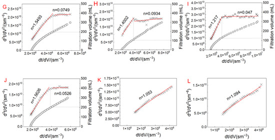 Figure 6. Fitting curves for the filtration data in the UV/Fe(II)/S(IV) system with different S(IV) dosages for treating EOM: (A) feed water, (B) 0 mM, (C) 0.5 mM, (D) 1.0 mM, (E) 1.5 mM, (F) 2.0 mM; and for treating ALW: (G) feed water, (H) 0 mM, (I) 0.5 mM, (J) 1.0 mM, (K) 1.5 mM, (L) 2.0 mM.