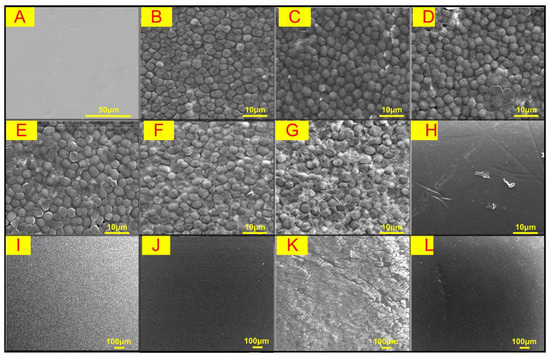 Figure 7. SEM images of (A) pristine membrane; (B) membrane fouled with ALW; (CG) membrane fouled with ALW pretreated by UV/Fe(II)/S(IV) with the S(IV) dosage at 0 mM, 0.5 mM, 1.0 mM, 1.5 mM, and 2.0 mM; (H) membrane after backwashing; (I,J) membrane fouled with EOM and after backwashing; and (K,L) membrane fouled with EOM pretreated by UV/Fe(II)/S(IV) with the S(IV) dosage at 1.5 mM and after backwashing.