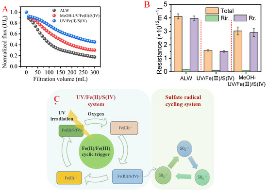 Figure 8. (A) Membrane flux variation and (B) Fouling resistance during ALW filtration under free radical scavenger. (C) The mechanism for the enhanced performance of the synergistic solid process of Fe(II)/UV/S(IV).