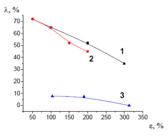 Strain recovery versus tensile strain for (1) HDPE, (2) PP, and (3) PET after their deformation via environmental crazing.