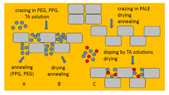 Figure 7 shows the general scheme illustrating the proposed approach for the preparation of NCMs: (A) environmental crazing of polymer films (PET, PP, HDPE) in oligomers + annealing under isometric conditions (PP, HDPE) = membranes PET, PP, HDPE with PEG and PPG; (B) environmental crazing of polymer films in the solutions containing modifying target additives (TA) in PALE + removal of a volatile liquid + annealing = HDPE-PVA, HDPE-SA, HDPE-PVA-SA membranes; (C) environmental crazing of polymer films in PALE + removal of PALE + annealing + doping with TA solutions + removal of PALE = surface-modified HDPE membranes.