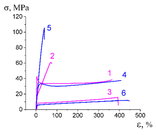 Stress-strain curves illustrating mechanical characteristics of the composite membranes: (1) initial PET; (2,3) PET (ε = 100%)-PEG (2) along and (3) perpendicular to the direction of tensile drawing; (4) initial PP; (5,6) PP (ε = 350 %)-PEG (5) along and (6) perpendicular to the direction of tensile drawing.