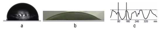 Multicomponent HDPE-SA and HDPE-PVA membranes doped with PVA and SA are permeable to water vapors: water vapor permeability of the HDPE-SA membranes is 216 g/(m2 day) for HDPE (ε = 100%), 850 g/(m2 day) (200%), HDPE-PVA 226 and 856 g/(m2 day) for HDPE (ε = 100 and 200%, respectively). PVA in nanoporous membranes does not swell in water, and the weight of the samples in aqueous solutions remains unchanged. The water contact angle WCA of the HDPE-PVA membrane (PVA 14 wt.%) is 30°; in other words, the incorporation of PVA into the mesoporous HDPE membrane provides its hydrophilization (Figure 9a,b), and WCA appears to be lower than the expected WCA of pristine PVA (40–45°). This evidence can be explained by the development of the surface relief as proved by profilograms constructed from the analysis of the corresponding AFM images: these profilograms clearly show nanoscale relief as ridges and depressions (Figure 9c).