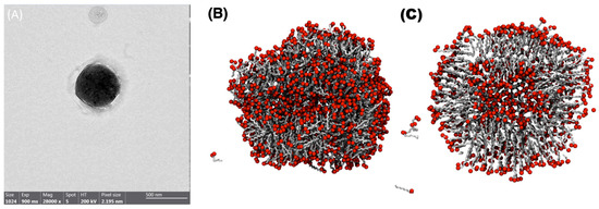 Experimental and theorical comparison of decanoic acid vesicles. (A) TEM image of decanoic acid vesicle prepared in ultra-pure water. (B,C) Snapshots after 300 ns of a decanoic acid molecular system at 25 °C.